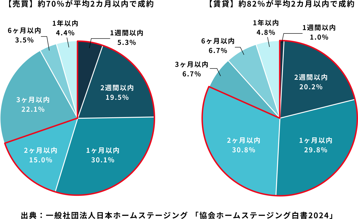 弊社では、売買物件・賃貸物件ともに実施後の早期成約に繋がっております。最短1日での売買物件のご成約実績あり。また、リフォームを最低限にした場合でもお部屋を魅せる力で家賃の減額をせずに成約するケースも数多くございます。